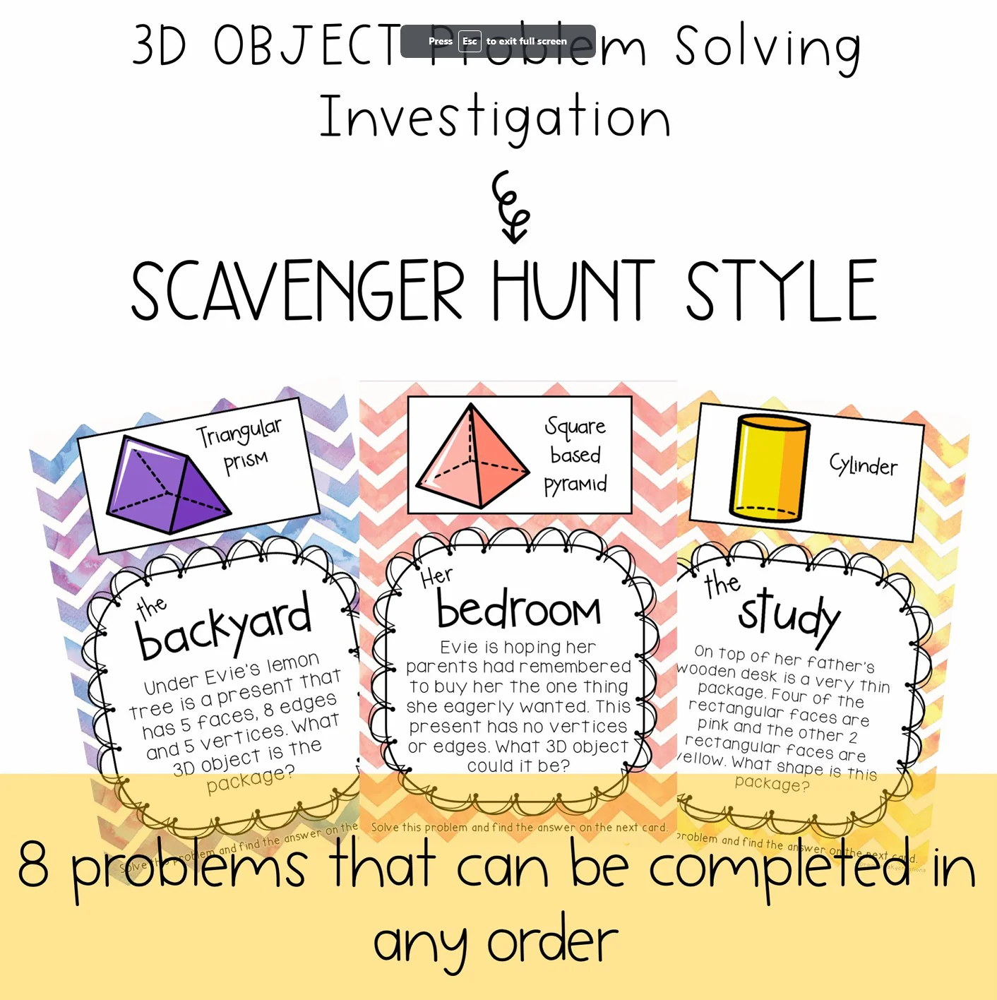 Students work on each problem by reading/solving it. They look for the answer to the question by looking for the 3D object and name on the top of the next card. When they find the one that matches the answer they are looking for, they begin working on the new problem underneath (if they cannot find the answer, this indicated to the student they have made a mistake and need to reread the question and attempt the problem again.) A recording page is included for students to complete throughout the investigation.