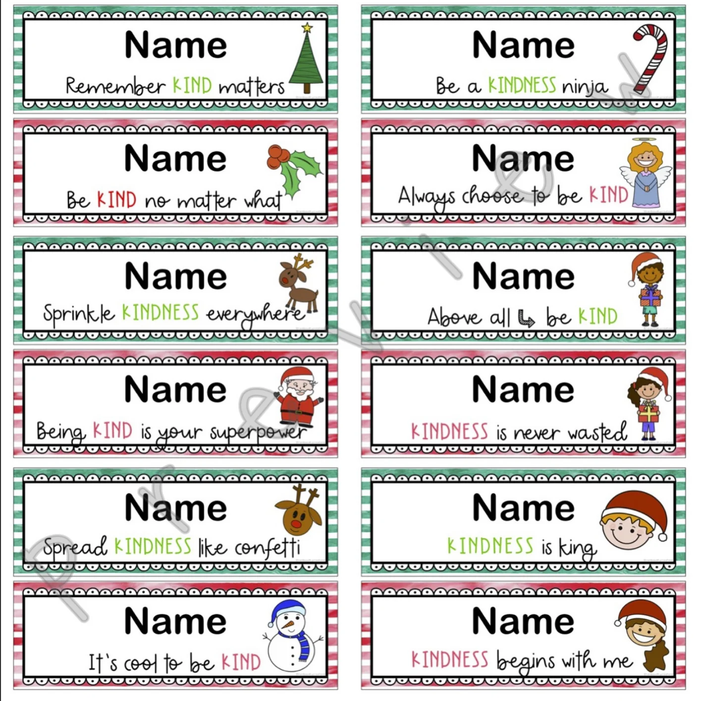 - Editable, Christmas themed desk plates with 12 different kindness quotes